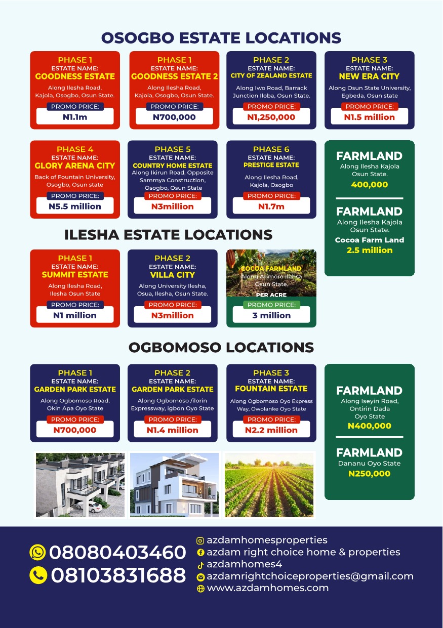 Discover a wide range of land and house options for sale with AZDAM CHOICE HOMES & PROPERTIES. Whether you’re searching for residential plots, commercial land, luxury homes, or affordable housing solutions, we have a diverse portfolio to meet your specific requirements. Our dedicated sales team provides personalized assistance, guiding you through property viewings, financing options, and the entire purchase process to help you find your ideal property investment.